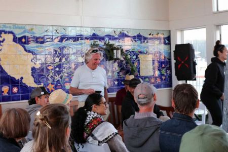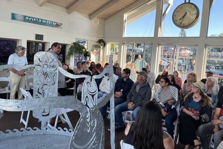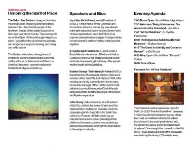 Moderated by Se’Si’Le Director Dr. Kurt Russo. Speakers included Se’Si’Le President Jay Julius Xw’tot lem, Lummi Artist A.Cyaltsa April Finkbonner, and Rueben George from Tsleil-Waututh Nation. The event was held for an audience of Friday Harbor residents, islanders, and visitors.