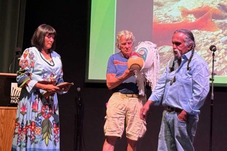 Event Host Alyssa Macy (Warm Springs Tribe) receiving the mask from Jewell James and Dr. Kurt Russo. Photo: Lisa Dabek