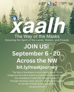 You can learn all about the Xaahl and the Way of the Masks campaign and tour by visiting Se'Si'Le's dedicated page for the tour events. Se’Si’Le’s partners include: Sierra Club, Save our wild Salmon, Washington Conversation Action, Intercommunity Peace and Justice Center.